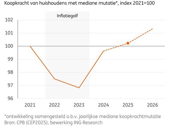 De verwachte stijging van de koopkracht in 2025 zorgt ervoor dat het eerder geleden koopkrachtverlies wordt goedgemaakt voor huishoudens. In doorsnee, want daarbij zijn er nog wel duidelijke verschillen tussen huishoudgroepen. Zo is de koopkracht van huishoudens in de laagste inkomensgroepen veelal al hersteld, terwijl er bij de hoogste inkomens en bij veel gepensioneerden nog wel wat koopkracht valt goed te maken. Daarnaast bestaat het risico dat een eventuele escalatie van de handelsoorlog het verdere herstel van de koopkracht onder druk zet.