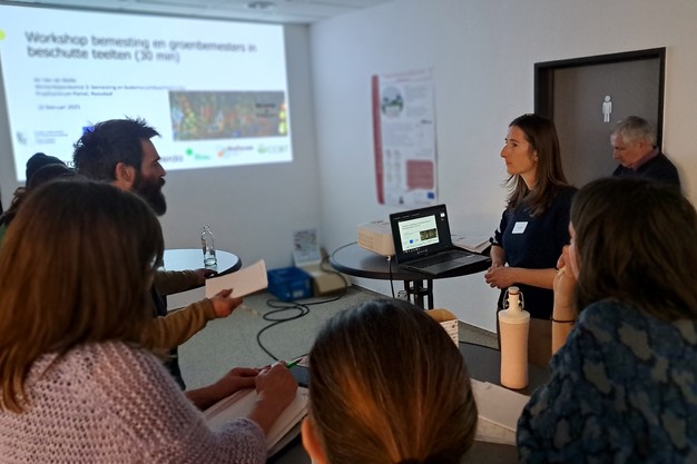 Rond vijf concrete thema's werden op het einde van de dag workshops georganiseerd. Het was mogelijk om aan twee workshops deel te nemen. Zo ging An Van de Walle (Viaverda) in gesprek met groentetelers over de bemesting en het gebruik van groenbemesters in beschutte teelten. Koen Willekens (ILVO) maakte de balans op tussen mineralisatie vanuit bodem en bemesting, gewasbehoefte en minimale verliezen naar het milieu en kon hiermee verschillende aanwezigen interesseren. Bram De Keyzer (Proefcentrum Pamel) besprak met een groep aardbeitelers hoe in de teelt duurzaam kan bemest worden en wat de opties zijn om aan de bodemgezondheid te werken.
