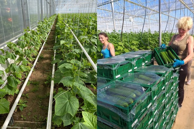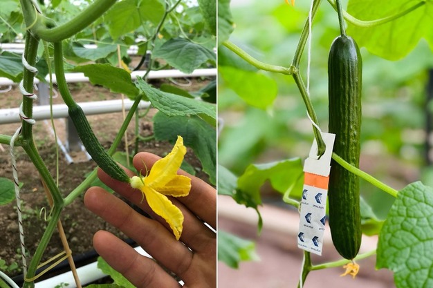 Links: Vers geplante biologische komkommeroogst. Rechts: Eerste komkommeroogst op teeltbedrijf Zell in Frankfurt