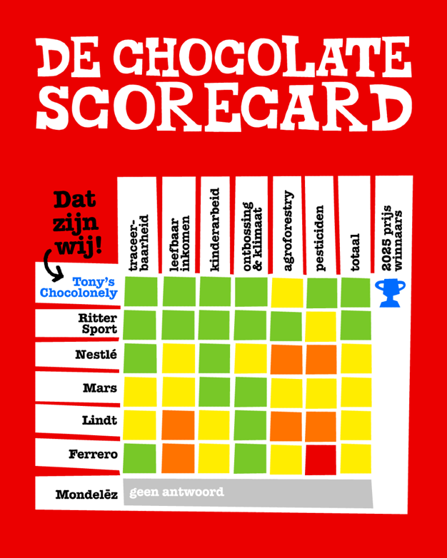 De Chocolate Scorecard beoordeelt bedrijven op zes belangrijke thema's binnen duurzaamheid en maatschappelijke verantwoordelijkheid in de cacao-industrie: traceerbaarheid, leefbaar inkomen, kinderarbeid, ontbossing en klimaatmaatregelen, agroforestry en gebruik van pesticiden. Tony's behaalde dit jaar de hoogste scores in vijf van de zes categorieën. Alleen op het gebied van agroforestry werd een gemiddelde score toegekend.