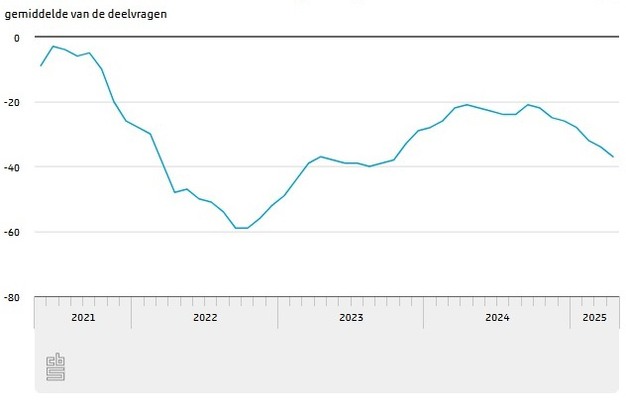Het consumentenvertrouwen daalde van -34 in maart naar -37 in april, meldt het CBS. Zowel het oordeel over het economisch klimaat als de koopbereidheid verslechterde. Aan het herstel van het consumentenvertrouwen, na het absolute dieptepunt in oktober 2022, kwam in het najaar van 2024 een eind. Na september is het vertrouwen zeven maanden op rij gedaald en staat het op de laagste stand in anderhalf jaar.