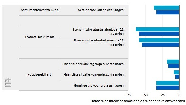 Consumenten waren in april negatiever over de economie dan in maart. De deelindicator economisch klimaat kwam uit op -61, tegen -57 in maart. Zowel het oordeel over de economische situatie in de komende twaalf maanden als het oordeel over de economische situatie in de afgelopen twaalf maanden verslechterde.