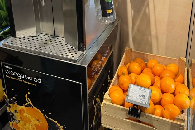 Een sapapparaat in een Duitse supermarkt met Demeter-sinaasappels van Eosta