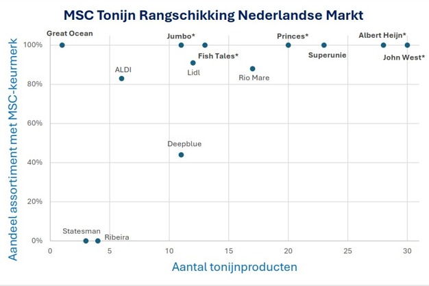Merken als Deepblue, te vinden bij Superunie-leden, kunnen voor het grootste deel van hun producten nog grotere stappen zetten op het gebied van duurzaamheid. Concrete plannen om deze producten zonder MSC-keurmerk te verduurzamen zijn bij MSC ook niet bekend. Hetzelfde geldt voor het merk Ribeira, dat enkel bij Jumbo wordt verkocht. Echter, ook voor goedkopere merken is er geen excuus om geen MSC-keurmerk te dragen. Statesman, te koop bij Superunie-leden en Albert Heijn, heeft nu geen keurmerk op de tonijn. Echter, hebben zij wel al concrete en geplande stappen gedeeld om een volledig tonijnassortiment te behalen waarop het blauwe MSC logo is te vinden, in het voorjaar van 2026.