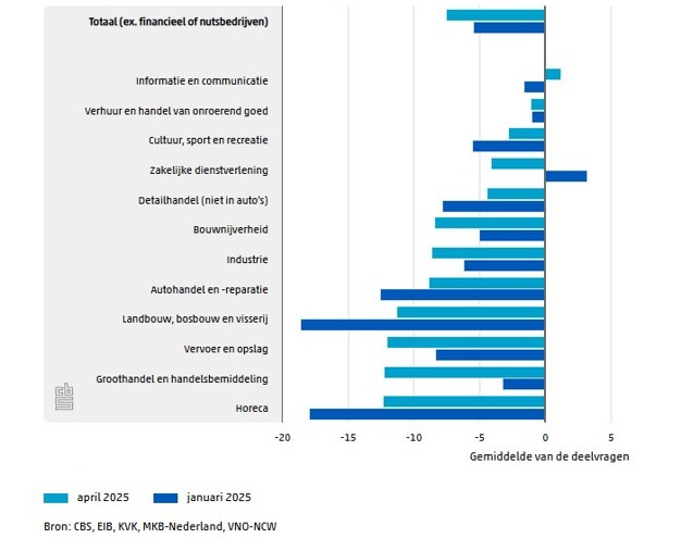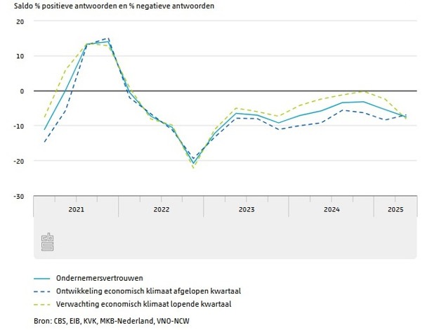 Het ondernemersvertrouwen is voor het tweede kwartaal op rij gedaald en komt in het tweede kwartaal van 2025 uit op -7,5. Vooral in de groothandel en handelsbemiddeling, en in de zakelijke dienstverlening, daalde het vertrouwen. Desondanks ervaren minder ondernemers belemmeringen en zijn exporterende bedrijven positief over hun buitenlandse omzet. Dit melden het CBS, de KVK, het EIB, MKB-Nederland en VNO-NCW op basis van de Conjunctuurenquête Nederland die in april is gehouden.