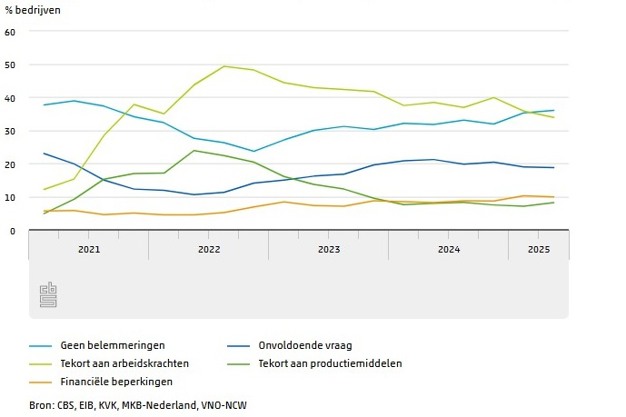Ondernemers noemen het tekort aan arbeidskrachten nog steeds het vaakst als de belangrijkste belemmering voor hun bedrijfsvoering. Het aandeel bedrijven dat dit noemt, daalt de laatste jaren echter wel, tot 34 procent aan het begin van het tweede kwartaal van 2025. De groep bedrijven die geen belemmeringen ervaart is in tweeënhalf jaar langzaam toegenomen tot 36 procent. Daarmee is die groep nu groter dan het aandeel bedrijven met een tekort aan arbeidskrachten.