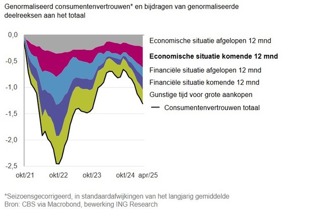 Kijken we naar het genormaliseerde vertrouwen dan zien we dat consumenten historisch gezien nu vooral relatief weinig vertrouwen hebben in het economische klimaat de komende 12 maanden. Economisch is er recent veel gebeurd. In het oog springt dan vooral het handelsbeleid van de Verenigde Staten. De (mogelijke) invoering van allerlei importtarieven en de mogelijke reactie van andere economieën daarop (kortweg "de handelsoorlog") hebben veel economische onzekerheid gecreëerd en bijvoorbeeld ook de beurzen flink laten bewegen. Het is goed voor te stellen dat deze handelsoorlog zich onder consumenten heeft vertaald in pessimisme over in de economie de komende 12 maanden.