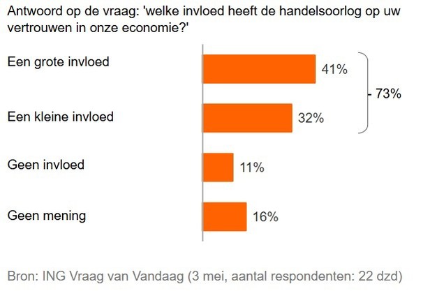 Bijna driekwart (73%) van de consumenten geeft aan dat de handelsoorlog invloed heeft op hun vertrouwen in de economie, zo blijkt uit een recent gestelde ING Vraag van Vandaag. Ruim vier op de tien ondervraagden (41%) geeft aan dat de handelsoorlog van grote invloed is op dat vertrouwen. Slechts 11% geeft aan geen invloed te zien. Al met al is de handelsoorlog dus voor het leeuwendeel van de consumenten een factor van betekenis voor onze economie.
