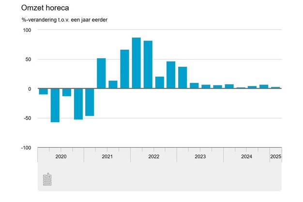 Het eerste kwartaal van 2025 is het zestiende kwartaal op rij waarin de horeca meer omzet dan in hetzelfde kwartaal een jaar eerder. Het laatste kwartaal waarin de omzet van de horeca kromp, was het eerste kwartaal van 2021 toen er nog diverse coronamaatregelen golden.
