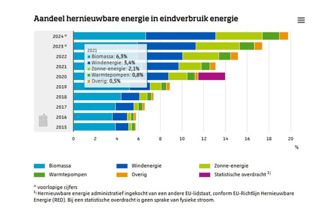 In 2024 was het aandeel hernieuwbare energie 19,8 procent van het totale energieverbruik in Nederland. Een jaar eerder was dit 17,4 procent. Deze stijging komt vooral doordat er veel nieuwe windmolens op zee in gebruik genomen zijn en omdat er meer biodiesel is verbruikt voor wegverkeer. Ten opzichte van vijf jaar geleden is het aandeel hernieuwbare energie meer dan verdubbeld. Dit blijkt uit voorlopige cijfers van het CBS.