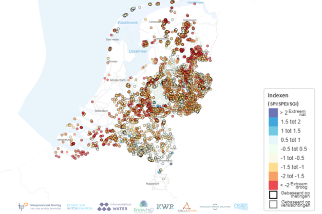 Ondergronds tekent zich een fundamenteel probleem af: grondwaterstanden zijn in grote delen van Nederland "zwaar tot extreem laag" (Figuur 1). Alleen delen van Zuid-Limburg en de flanken van de stuwwallen zijn de grondwaterstanden gemiddeld voor de tijd van het jaar. Hier reageert het grondwatersysteem traag en is het effect van de natte herfst en winter nog zichtbaar.
