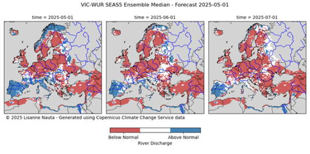 Lisanne Nauta: "Onze onderzoeksgroep levert bijdragen aan de langetermijnverwachtingen van het ECMWF, waarbij we specifiek kijken naar rivierafvoeren in Europa voor de komende maanden. Voor mei en juni laten de prognoses zien dat in grote delen van Europa de afvoeren onder het langjarig gemiddelde liggen (Figuur 2). Dit geldt nadrukkelijk ook voor de bovenstroomse gebieden van de Rijn en de Maas, waar een combinatie van een droge winter, geringe sneeuwval en beperkte lente-neerslag leidt tot sterk verminderde toevoer."