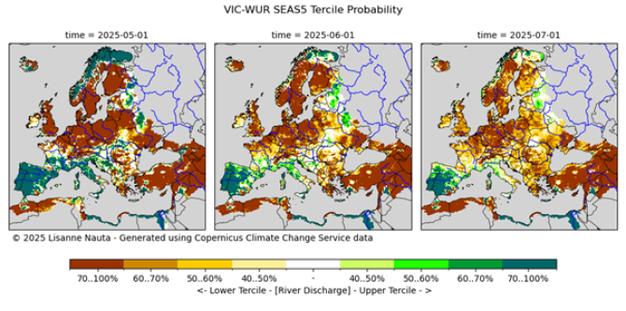 Figuur 3 – Kansverdeling van rivierafvoer in de categorieën laag, normaal en hoog (Tercile Probability). De tercielverdeling van de verwachte afvoer wijst op een verhoogde kans op (zeer) lage rivierafvoeren in Midden- en Noordwest-Europa. Dit duidt op een aanhoudend droogterisico in de regio. De analyse is gebaseerd op modelresultaten van het grootschalige hydrologische model VIC-WUR.