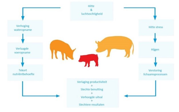Hittestress treedt op wanneer een varken zijn lichaamstemperatuur niet meer goed kan reguleren. Varkens hebben weinig zweetklieren en zijn daarom sterk afhankelijk van hun omgeving om af te koelen. Ze zoeken de koelste plekken op en gaan sneller ademen om via verdamping warmte kwijt te raken. Bij temperaturen boven de 22 – 25°C wordt het moeilijker om voldoende af te koelen en begint het risico op hittestress toe te nemen, zeker bij hogere luchtvochtigheid.