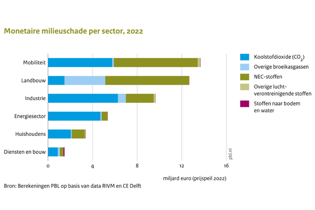 Mobiliteit is de sector die meeste milieuschade veroorzaakt (30 %), gevolgd door landbouw (27 %; waarvan twee derde door veeteelt) en industrie (21%). In de mobiliteit kan elektrificatie tweevoudig effect hebben om de veroorzaakte milieuschade te verminderen, doordat dit zowel de uitstoot van het broeikasgas CO₂ vermindert als de uitstoot van NOx, dat schadelijk is voor de gezondheid van mens en natuur. In de landbouw zorgen vooral het broeikasgas methaan en de luchtverontreiniging door ammoniak voor milieuschade. Die zijn vooral afkomstig van de veeteeltsector in Nederland.