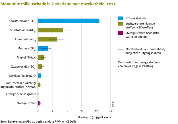De broeikasgassen CO₂, methaan en N2O zorgen voor iets meer dan de helft van de berekende schade. Luchtverontreinigende stoffen die onder de Europese NEC-richtlijn vallen (NOx, ammoniak, zwaveldioxide, fijnstof en NMVOS) veroorzaken bijna alle andere schade. Andere schadelijke stoffen, waarvan de emissies meestal veel lager liggen, zorgen voor de resterende twee procent van de schade.