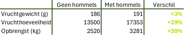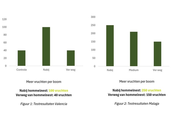 Proeven in Spanje en Turkije, uitgevoerd in samenwerking met universiteiten, tonen aan dat hommelnesten de opbrengst consistent met 30 tot 50% verhogen, zonder dat de gemiddelde vruchtgrootte afneemt. In sommige gevallen gaven bomen dicht bij de hommelnesten meer dan twee keer zoveel vruchten als bomen verderop.