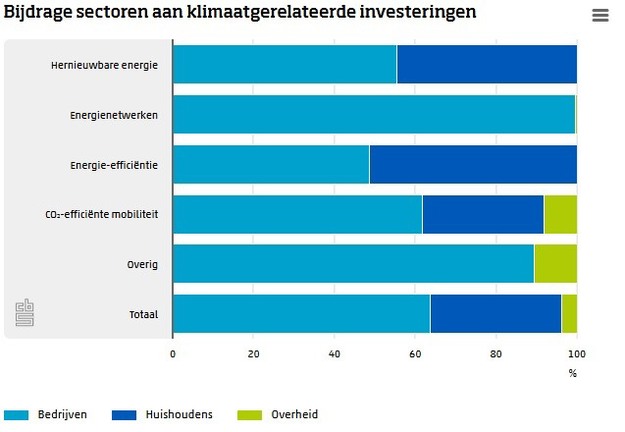 Bedrijven nemen 64 procent van de klimaatgerelateerde investeringen voor hun rekening. Zij investeren vooral in elektrische en hybride voertuigen, het elektriciteitsnetwerk en hernieuwbare energie (windenergie en zonnepanelen).