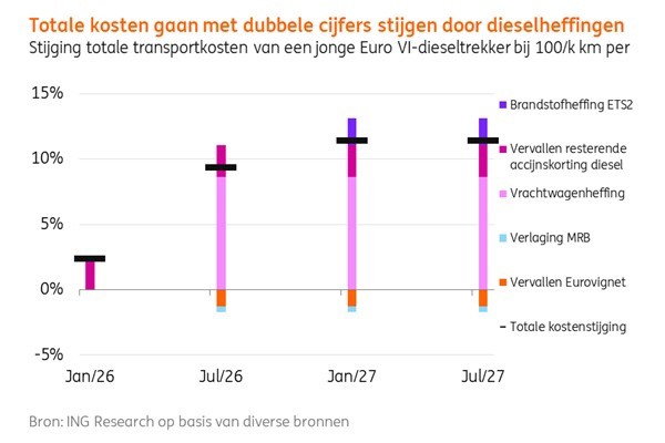 De Nederlandse wegtransportsector staat voor een nieuwe fase. Vanaf volgend jaar worden dieseltrucks in het gebruik een stuk duurder en dat verandert de dynamiek bij investeringen. Zo vervalt de resterende accijnskorting in 2026, wordt de vrachtwagenheffing (tot 19,5 cent/km) ingevoerd en volgt in 2027 de Europese brandstofheffing ETS 2. Elektrische vrachtwagens gaan wel iets betalen voor gebruik van de wegen, maar slechts een klein deel. Hierdoor wordt het kostenverschil per kilometer tussen diesel en elektrische trucks (2 tot 3 keer zo duur in aanschaf) een stuk kleiner. De transportkosten van diesels gaan daarbij de komende twee jaar per saldo met zo'n 10 tot 12% omhoog. Uiteindelijk komt dit bij de consument terecht, maar doordat het transport doorgaans minder dan 5% van de productkosten uitmaakt, zal die hier niet heel veel van merken. Beprijzing van emissies is bovendien nodig om een gelijk speelveld te creëren en de instroom van elektrische trucks verder te stimuleren.