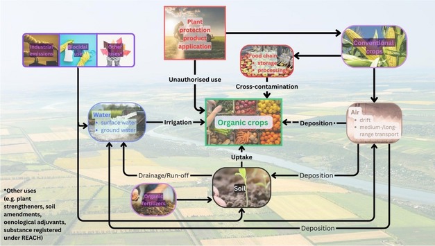 Residuen kunnen zich ook in het milieu ophopen, bijvoorbeeld door industriële emissies, lozingen of gebruik van biociden, en zo indirect in biologische landbouwproducten terechtkomen. Bodem en water kunnen hierbij een rol spelen, bijvoorbeeld via opname door de plant of indirecte besmetting. EFSA wijst op het belang van het onderscheiden van deze achtergrondniveaus en daadwerkelijke overschrijdingen door onrechtmatig gebruik.
