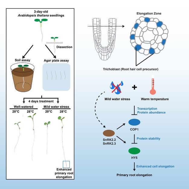© WUR | Hayes, Leong et alSynergie tussen warmte (28 °C) en milde droogtestress stimuleert wortelgroei in Arabidopsis via de kinases SnRK2.2/2.3, de E3-ligase COP1 en de transcriptiefactor HY5 (illustratie: WUR; Hayes, Leong et al., Current Biology, CC-BY Open Access publication