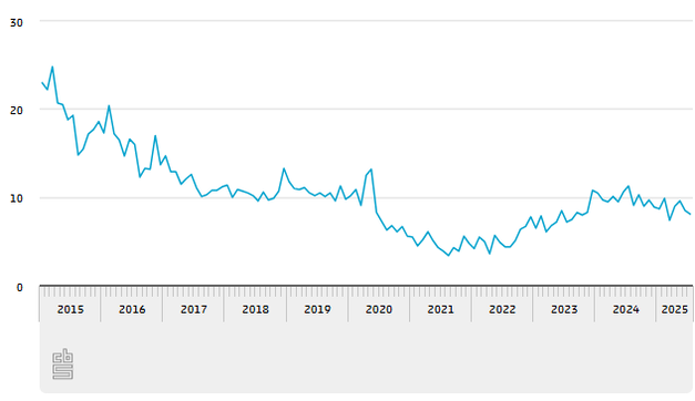 De faillissementsgraad kwam in juli uit op 8,1. Een jaar eerder werden er per 100 duizend bedrijven 11,3 bedrijven failliet verklaard.