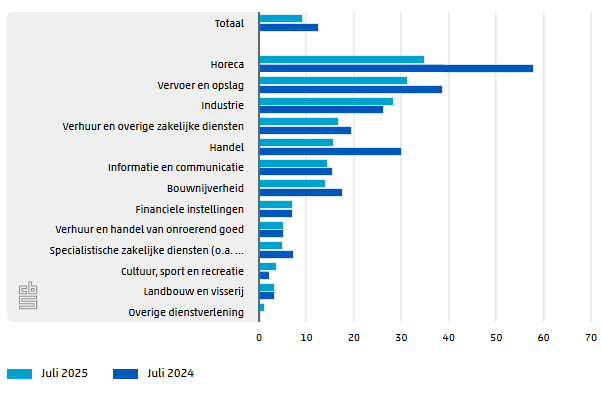 Niet voor zittingsdagen gecorrigeerd werden in juli relatief gezien de meeste faillissementen uitgesproken in de horeca. Per 100 duizend bedrijven in de horeca gingen er 35,1 failliet, een jaar eerder waren dat er 58,1.