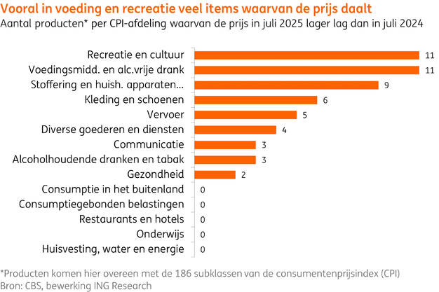 Waar veel consumenten echter vaak veel minder vocaal over zijn, is het feit dat er ook producten zijn waarvan de prijzen dalen. Als we wat dieper in de inflatiecijfer duiken, dan blijkt echter dat er ook veel producten goedkoper zijn geworden. Van de 186 zogenoemde product-"subklassen" in het mandje van de consumentenprijsindex (CPI) van het CBS, lag de prijs van 54 producten in juli van dit jaar lager dan in juli 2024 en kan dus gesproken worden van "deflatie". Die producten zijn goed voor 17% van het totale inflatiemandje. Dat is best een behoorlijk deel. In de CPI-categorieën voedingsmiddelen & alcoholvrije dranken en recreatie & cultuur waren de meeste producten met deflatie te vinden.