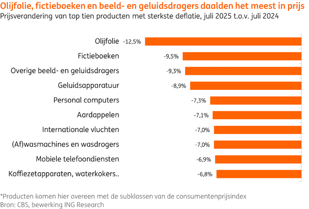 In juli steeg het gemiddelde prijspeil voor consumenten met 2,9% ten opzichte van een jaar eerder. Achter deze nog behoorlijke inflatie gaan grote verschillen schuil. Zo zien we niet alleen prijsstijgingen, ook is een flink aantal producten in prijs gedaald. Vooral olijfolie, fictieboeken en beeld- en geluidsdragers werden goedkoper. Consumenten profiteerden gemiddeld het meest van deflatie van benzine, internationale vluchten en mobiele telefoondiensten. Lagere prijzen zijn onder meer te danken aan technologische ontwikkeling, aangepaste handelsafspraken en een waardestijging van de euro.