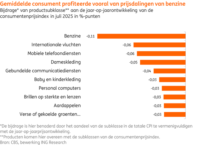 De 54 gerapporteerde prijsdalingen hebben samen het totale inflatiecijfer van juli met 0,64%-punt omlaag gebracht. Best belangrijk dus, die prijsdalingen. Consumenten konden in juli 2025 het meest profiteren van de prijsdaling jaar-op-jaar van benzine; hiervan was de negatieve bijdrage op het totale inflatiecijfer maar liefst -0,11%-punt. Dit komt door de combinatie van een bovengemiddelde prijsdaling (-5,2%) en een substantieel aandeel van benzine (van ruim 2%) in het inflatiemandje. In juli 2024 was de olieprijs relatief hoog en hoger dan afgelopen maand, onder andere vanwege reacties op militaire activiteit in Libanon en omdat de OPEC de olieproductie toen actiever beperkte dan juli jongstleden. Naast benzine leverden ook internationale vluchten, mobiele telefoondiensten en kleding de afgelopen maand een noemenswaardige neerwaartse bijdrage aan de gemiddelde inflatie.