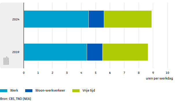 In 2024 zaten Nederlandse werknemers gemiddeld 8,8 uren per werkdag. Het gaat om gemiddeld 4,5 uur tijdens het werk, 1 uur woon-werkverkeer (exclusief fietsen) en 3,3 uur in de vrije tijd op een werkdag.