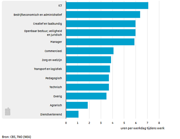 In 2024 brachten werknemers (15 tot 75 jaar) in ICT-beroepen, zoals databank- en netwerkspecialisten, gemiddeld de meeste tijd zittend door tijdens het werk: 7,1 uur per dag. Ook werknemers in bedrijfseconomische en administratieve functies, zoals accountants, zaten veel tijdens hun werkdag. Daarentegen zaten werknemers in dienstverlenende beroepen, zoals kelners, barpersoneel en schoonmakers, juist het minst: gemiddeld 1,1 uur per werkdag.