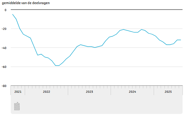 Het vertrouwen van consumenten was in augustus net zo negatief als in juli, meldt het CBS. Het consumentenvertrouwen bleef staan op -32. Ook het oordeel over het economisch klimaat en de koopbereidheid bleven even negatief.