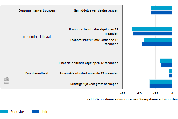 Consumenten waren in augustus even negatief over de economie als in juli. De deelindicator economisch klimaat bleef onveranderd staan op -52. Het oordeel over de economische situatie in de komende twaalf maanden verbeterde, terwijl het oordeel over de economische situatie in de afgelopen twaalf maanden verslechterde.