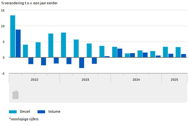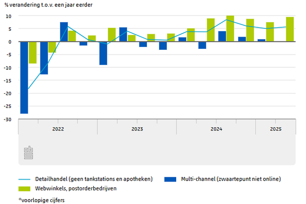In het tweede kwartaal van 2025 nam de online omzet van detailhandelaren toe met 5,6 procent vergeleken met dezelfde periode een jaar eerder. Bij winkels die uitsluitend online verkopen groeide de omzet met 9,6 procent. Bij multichannelers, detaillisten die hun producten zowel online aanbieden als via een fysieke winkel, bleef de omzet met een ontwikkeling van 0,1 procent nagenoeg gelijk.