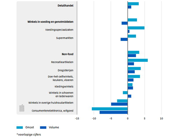 In het tweede kwartaal steeg de omzet van winkels in voeding en genotmiddelen met 2,8 procent vergeleken met een jaar eerder. Supermarkten (2,5 procent) en voedingsspeciaalzaken (5 procent), zoals kaaswinkels en slagerijen, haalden een hogere omzet. Dit komt door prijsstijgingen, de volumeontwikkelingen van de supermarkten (-2,1 procent) en de voedingsspeciaalzaken (0,6 procent) bleven achter. De cijfers zijn gecorrigeerd voor kalendereffecten.