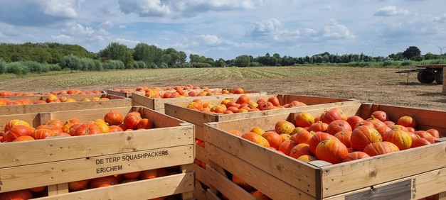 Momenteel ligt de verkoop van de nieuwe oogst nog op een laag pitje. "Die gaat traditiegetrouw vanaf oktober, november weer lopen. De piek in de afzet ligt traditiegetrouw in de herfst en winter", aldus de teler. Het grootste deel, ongeveer 95% van onze omzet, wordt gerealiseerd met de oranje pompoen, maar bij De Terp Squashpackers worden ook specials als de Spaghetti-pompoen, Crown Prince en Groene pompoen geteeld. "Wij blijven ons als De Terp hard maken voor de oranje (winter squash) pompoen."
