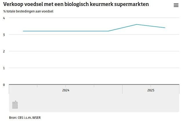 In het eerste halfjaar van 2025 ging 3,5 procent van de bestedingen aan voedsel in de Nederlandse supermarkten naar producten met een biologisch keurmerk (820 miljoen euro). In de periode 2018 tot en met 2024 was dat gemiddeld 3,0 procent. Bij eieren is het aandeel biologische verkopen relatief het grootst, gevolgd door koffie en thee. Dit meldt het Centraal Bureau voor de Statistiek (CBS) op basis van de BioMarktMeter en de Monitor Duurzaam Voedsel, uitgevoerd in samenwerking met Wageningen Social & Economic Research (WSER).