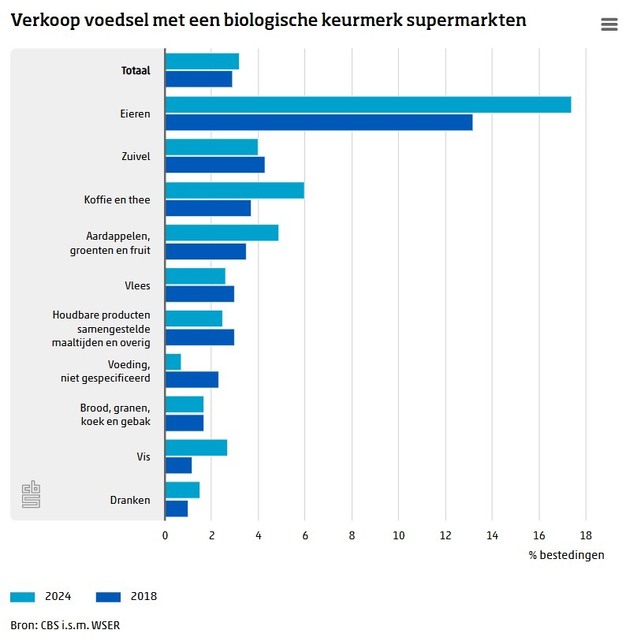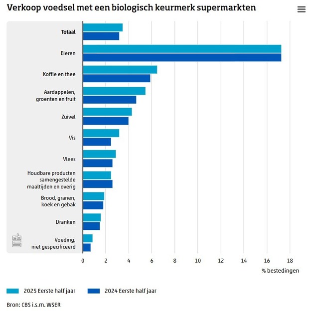 Bij eieren is van alle productgroepen naar verhouding het grootste deel van de verkopen biologisch. In de eerste helft van 2025 was dat 17,3 procent. Op de tweede plaats staat koffie en thee met 6,5 procent, gevolgd door aardappelen, groente en fruit met 5,5 procent.