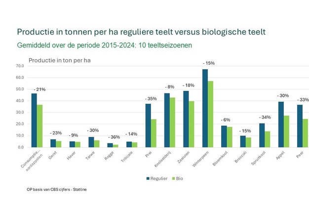Volgens Hidde Boersma van WePlanet tonen nieuwe cijfers uit de database van het CBS aan dat biologische landbouw in Nederland structureel lagere opbrengsten heeft dan reguliere teelt. Hij liet tien jaar aan CBS-data analyseren, waarbij opbrengsten van biologische en gangbare landbouw met elkaar zijn vergeleken. De verschillen lopen op tot ruim 30 procent per gewas, zo geeft Hidde aan.