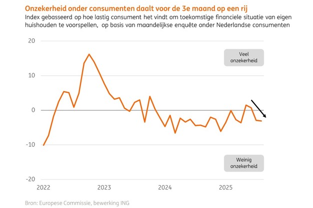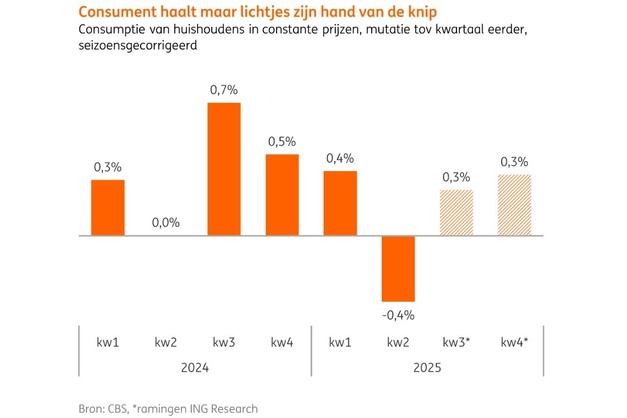 ING Research voorziet dat de consumptie in de tweede helft van 2025 geleidelijk aantrekt, met een groei van circa 0,3% per kwartaal. Historisch gezien is dat bescheiden. In 2026 zou de bestedingsbereidheid sterker toenemen, waardoor de consument weer een belangrijkere motor van de Nederlandse economie wordt.