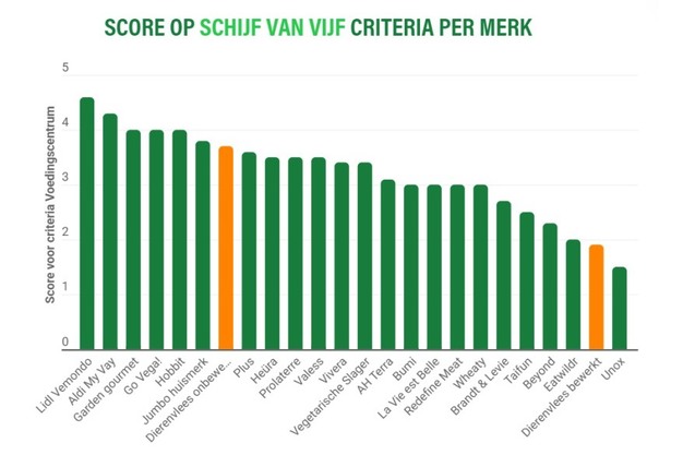 Gemiddelde totaalscores voor alle criteria van het Voedingscentrum van plantaardige vervangers per merk (groen), afgezet tegen bewerkte en onbewerkte dierlijke referentieproducten (oranje).