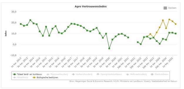 Het vertrouwen dat biologische boeren en tuinders in de land- en tuinbouw in hun onderneming hebben, is in het tweede kwartaal van 2025 gedaald ten opzichte van het eerste kwartaal van 2025. De Agro Vertrouwensindex staat nu op 18,5 punten ten opzichte van 21,1 punten.