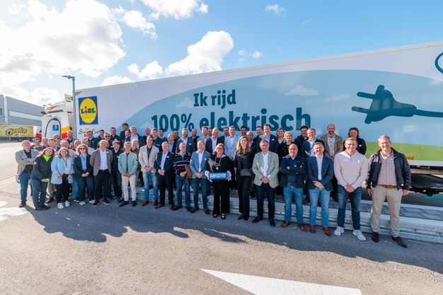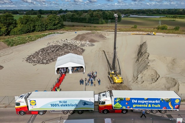 Dinsdag 23 september vierde Lidl twee belangrijke mijlpalen op haar distributiecentrum in Etten-Leur: de officiële ingebruikname van het vijfde snellaadplein voor elektrische vrachtwagens én het slaan van de eerste paal voor de uitbreiding van het distributiecentrum met 15.000 vierkante meter. Daarmee groeit het distributiecentrum naar een totale oppervlakte van 53.000 vierkante meter. Vanuit deze locatie worden dagelijks 63 Lidl-winkels in de regio bevoorraad met elektrische en biobrandstof aangedreven vrachtwagens.