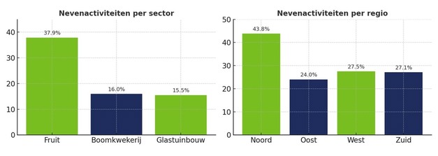 Ook regionaal zijn er verschillen zichtbaar. Zo ligt het percentage bedrijven met nevenactiviteiten in Noord-Nederland met ruim 43% duidelijk hoger dan in andere landsdelen. In West- en Zuid-Nederland ligt dit percentage dichter bij het landelijke gemiddelde (ca. 27%).