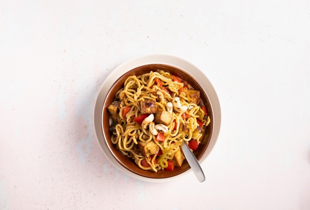 © TerraSanaRamen noodles met hoisin, tofu, paprika, prei, ui, cashewnoten en sesamolie