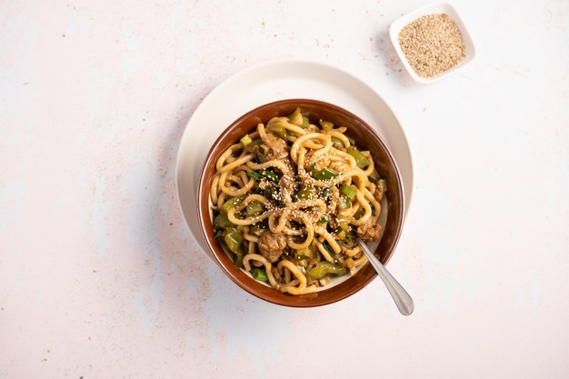 © TerraSanaUdon noodles met hoisin woksaus, groene paprika, courgette, bosui en seitan