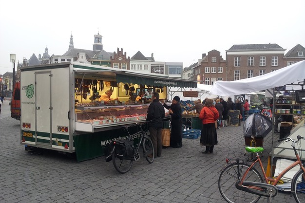 De oude verkoopkar van Uw Biologische Slager op de biologische markt in Den Bosch