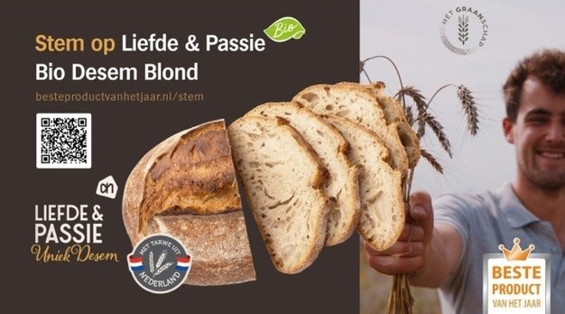 "Ons Biologisch Desem Blond brood, dat we bakken bij Bakkerij Van de Kletersteeg in Stoutenburg, is genomineerd voor 'Beste Product van het Jaar'!" schrijft Renee Pater op LinkedIn. "Dit brood maken wij met Nederlandse biologische tarwe van onze ruim 50 bioboeren binnen Het Graanschap."