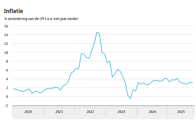 In oktober 2025 lagen de prijzen voor consumentengoederen en -diensten 3,1 procent hoger dan een jaar eerder, meldt het CBS. In september was de inflatie nog 3,3 procent. Het cijfer komt overeen met de snelle raming van 31 oktober.